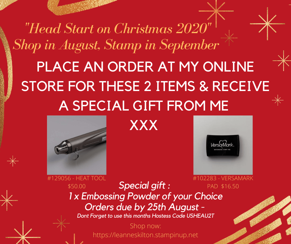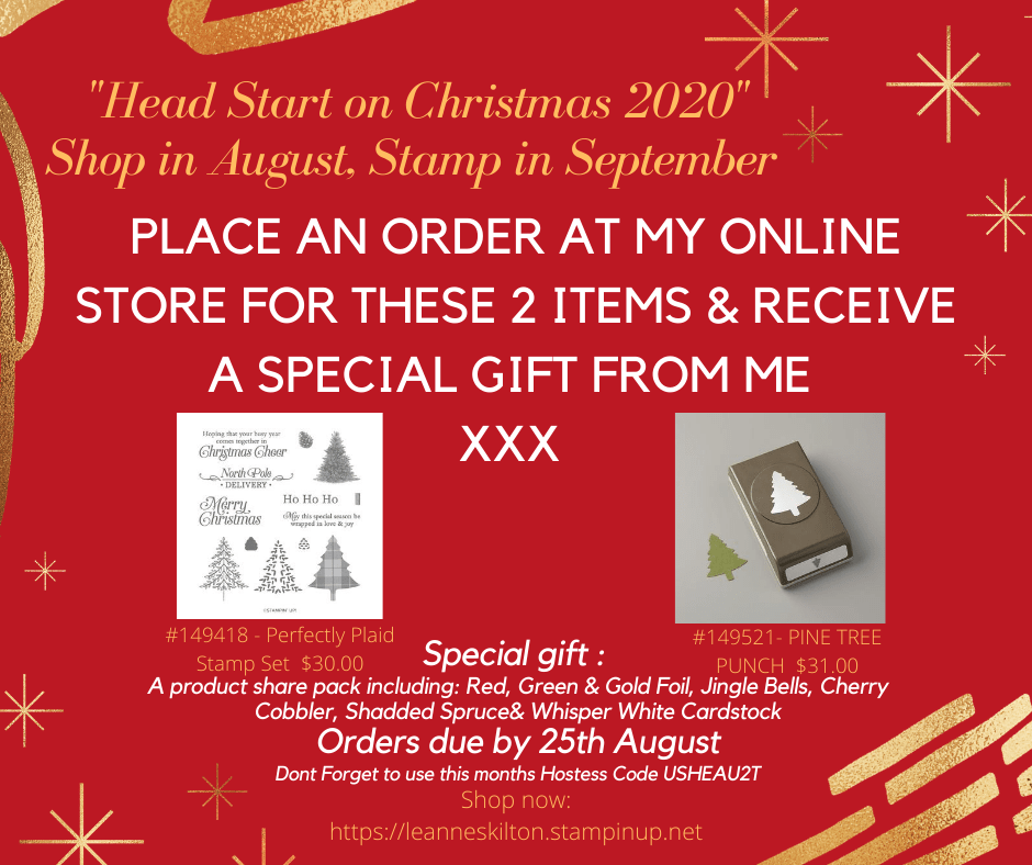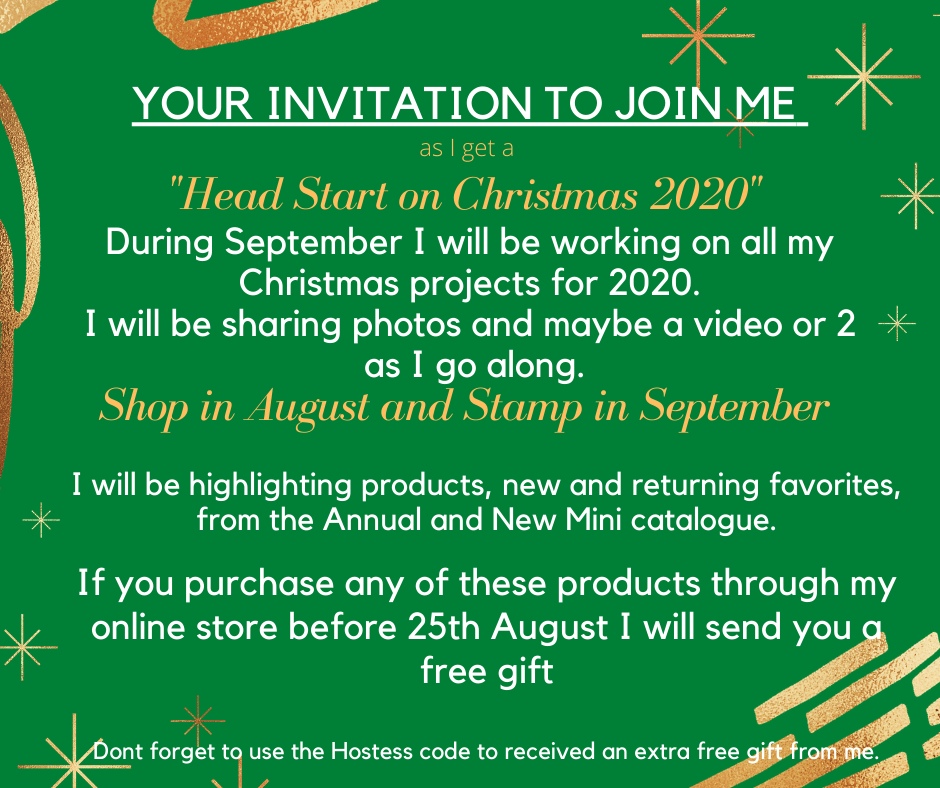 I am super excited to share with you what I am doing during August and September. In conjunction with the New Mini Catalogue going live, I will be getting a “Head Start on Christmas 2020”.