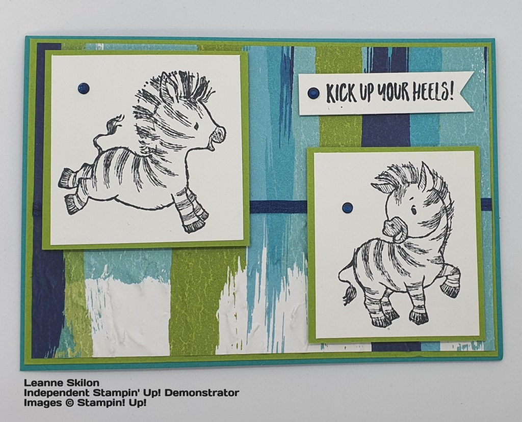 Today’s card is such a cutie using the Zany Zebras Stamp Set. It is just simple stamping and Designer Series Paper. For added interest I have embossed a part of the DSP with the Old World Paper 3D Embossing Folder.