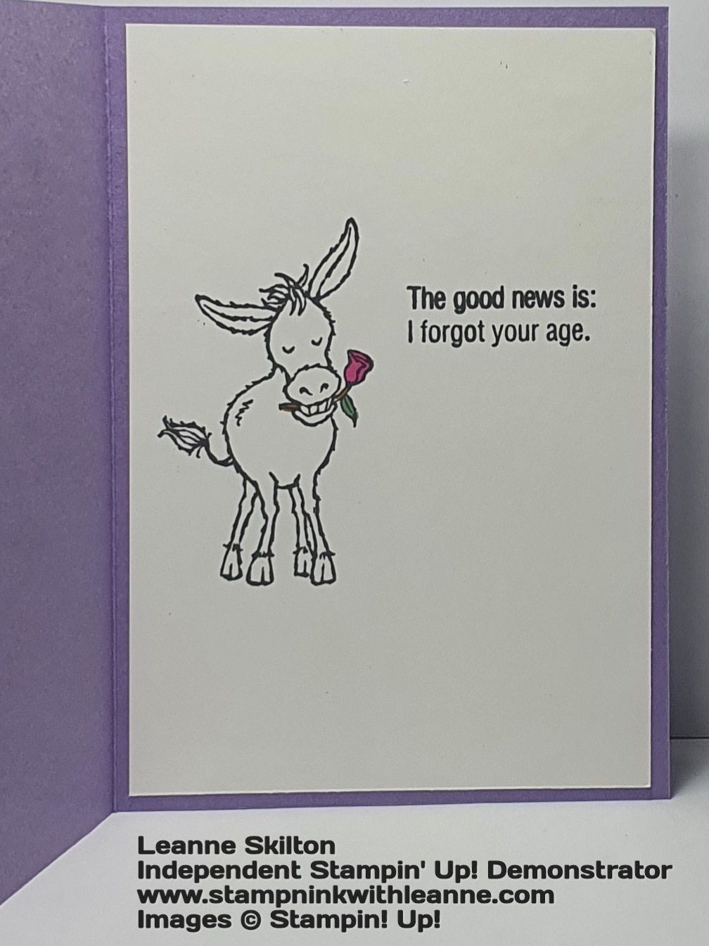 I then added a few embellishments to finish the card. Small Blooms Punch, Wink Of Stella, Basic Rhinestones and some Ribbon. By masking the stamp I was able to have a complete humorous card. I just love the cheekiness of the Donkey on the inside.