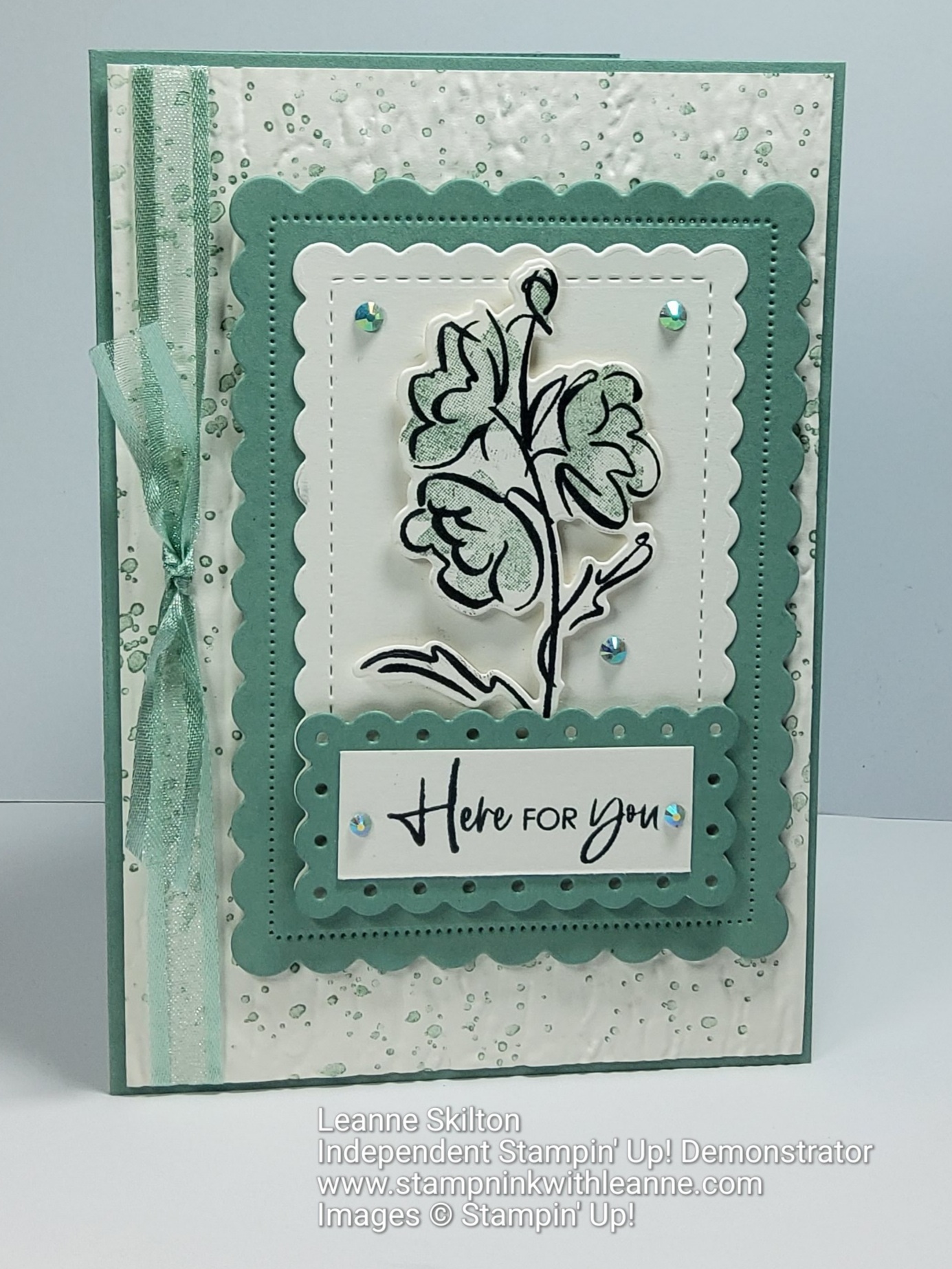 I used the same stamp set and embellishments, but I changed the colour again and added some die cuts and dry embossing…