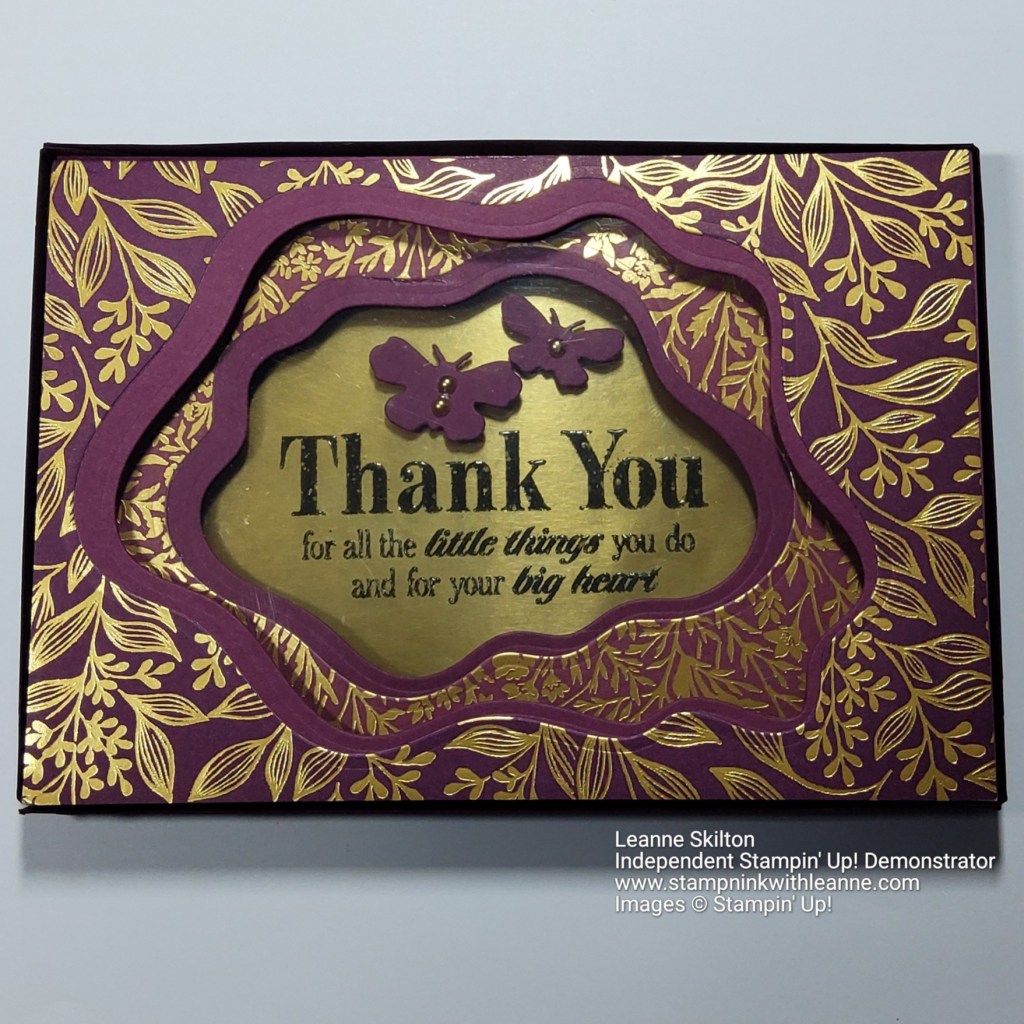 Here is todays card. This is a card in a box. I was so keen to use the new #156458 Blackberry Beauty Specialty Paper (from the new mini catalogue) and the Layering Diorama Dies and this is what I came up with.